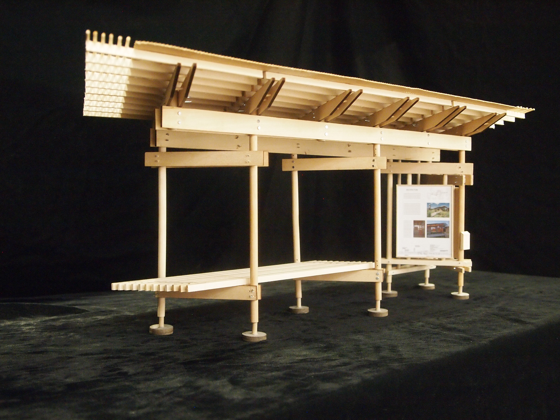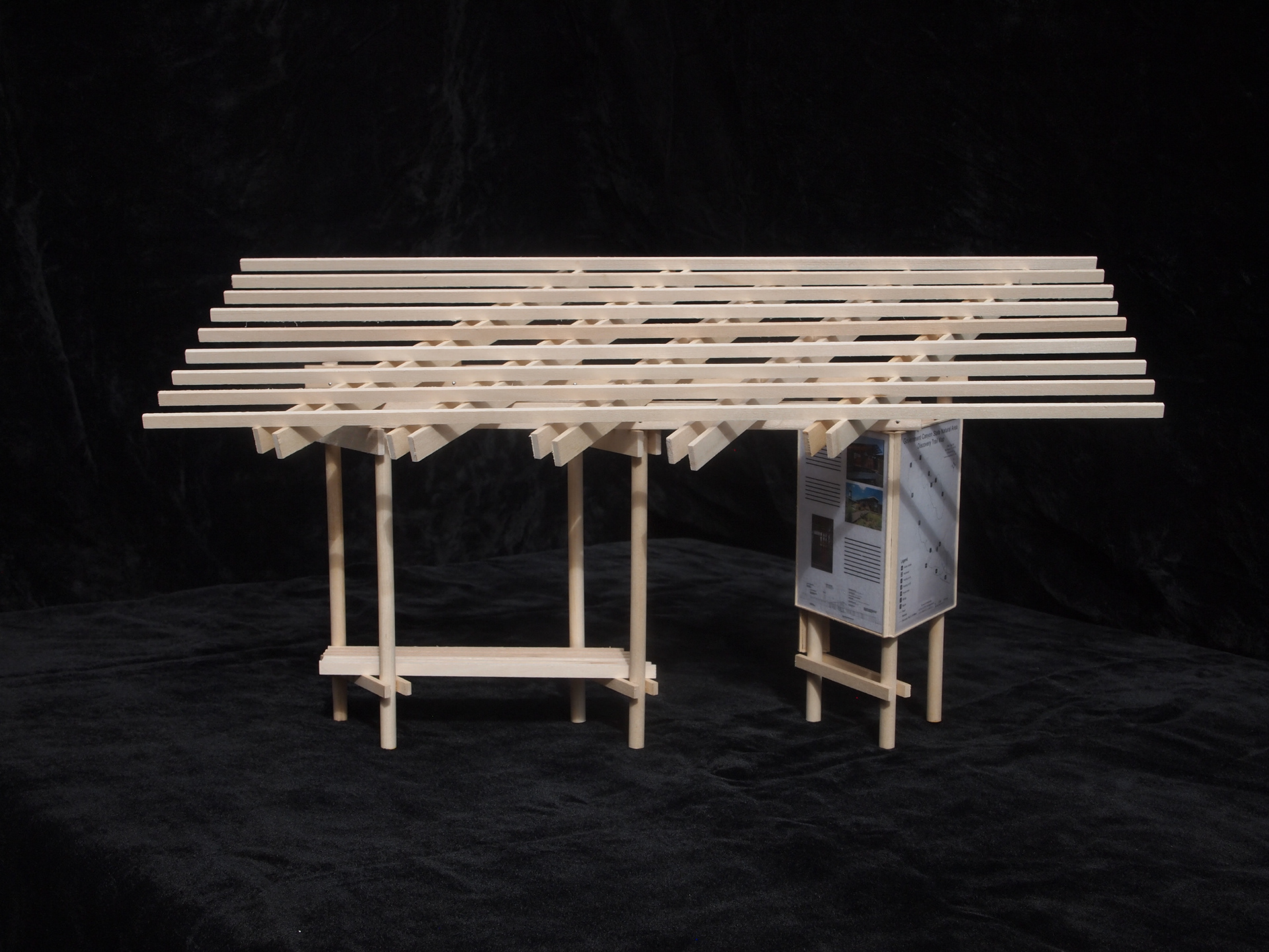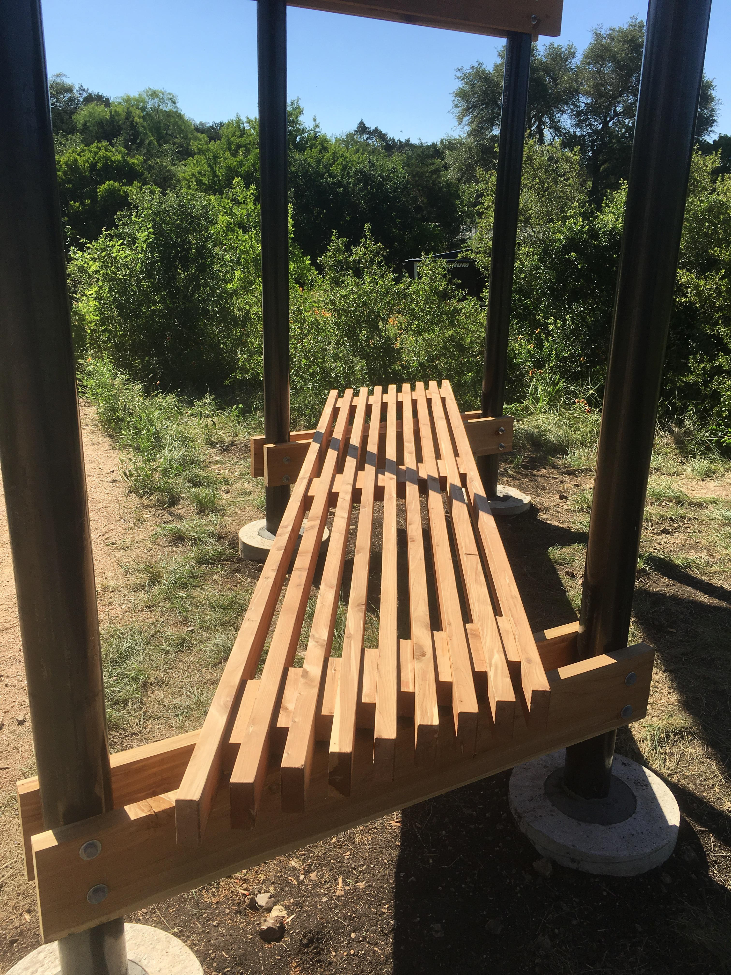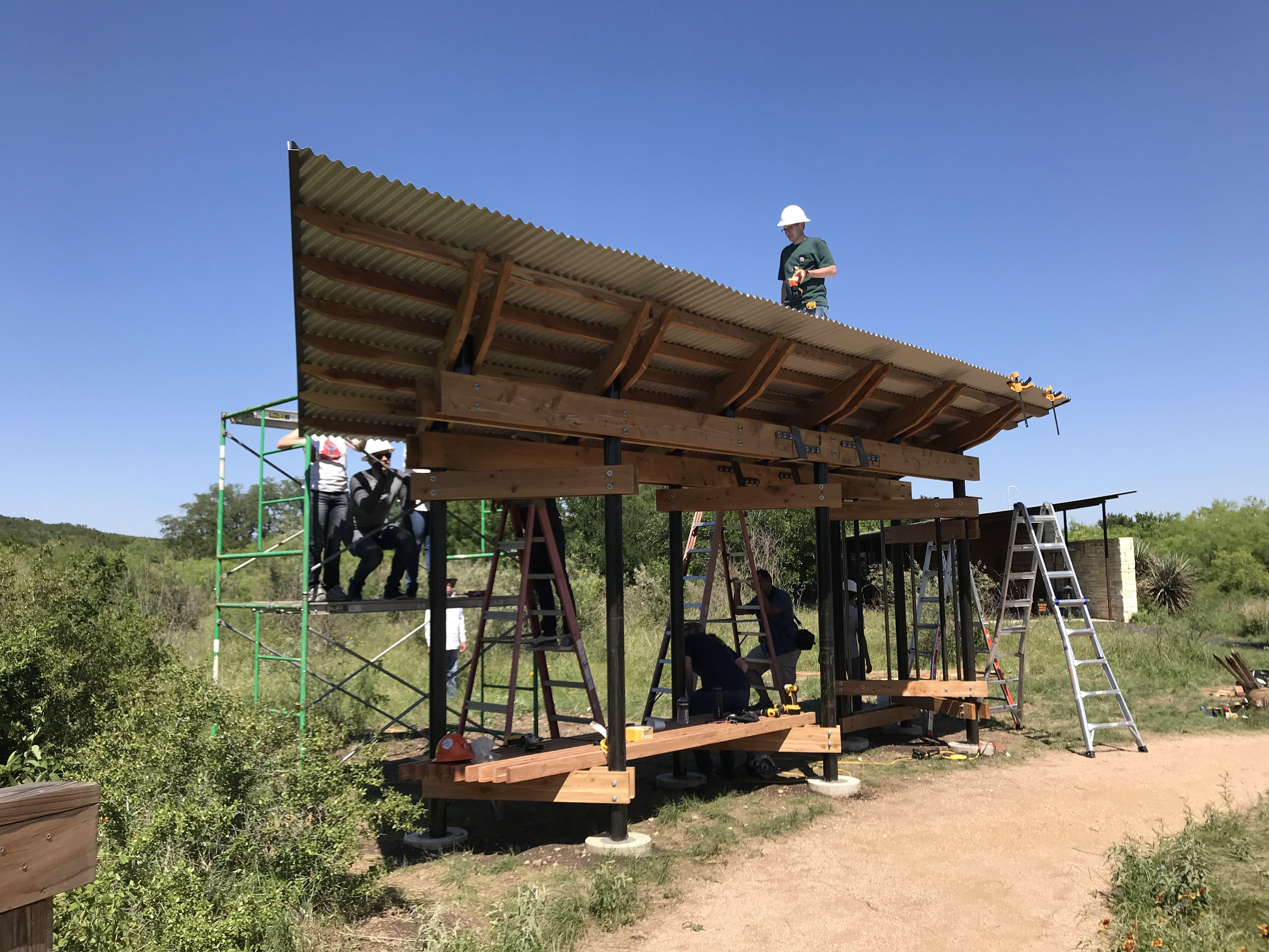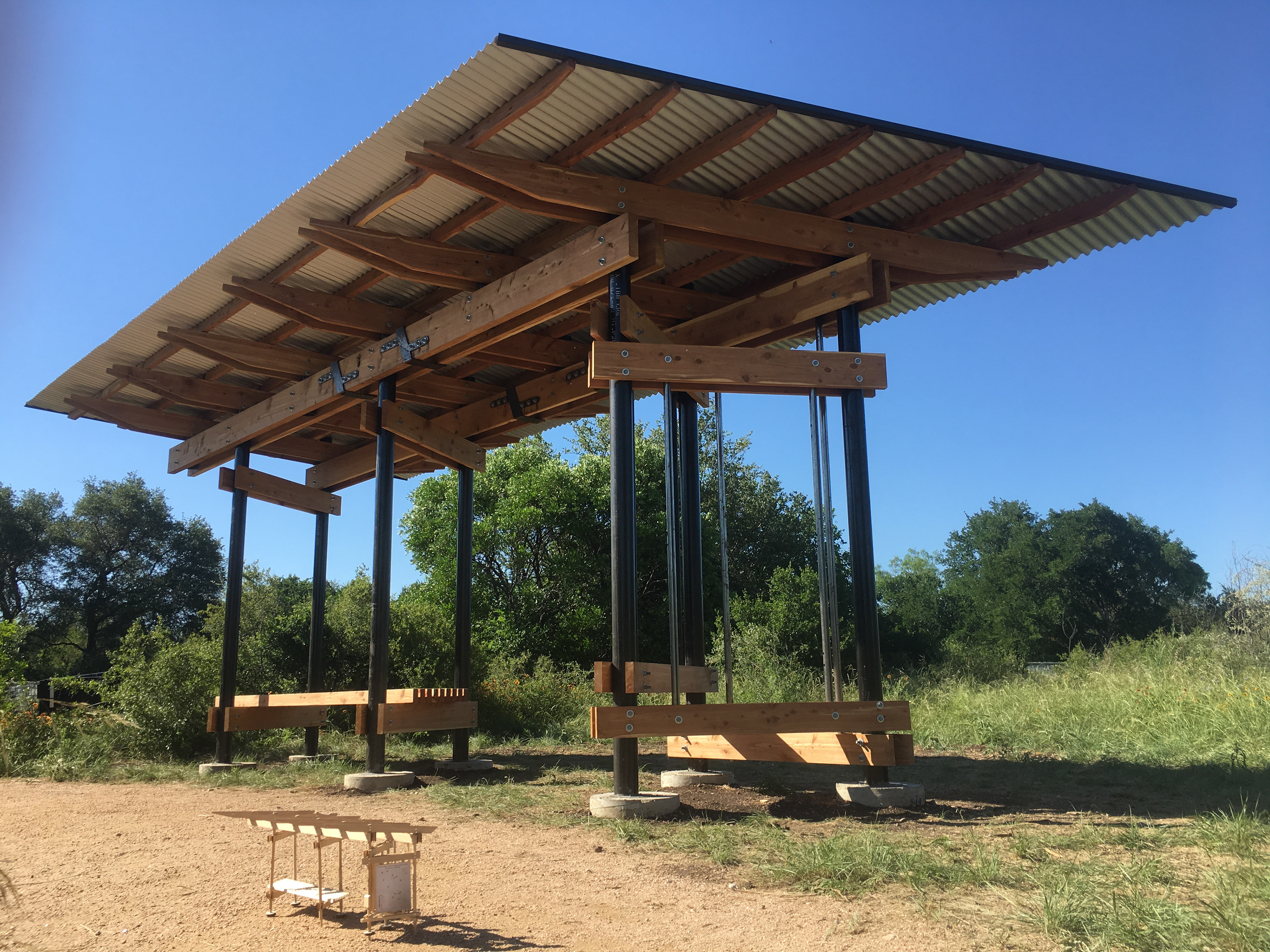 The Government Canyon Trailhead is a small design build project designed to house a map for the new handicap accessible Discovery Trail. It was important for the park to have a place for hikers to rest and shaded place to study the trail maps. The material pallet and design came from the existing architecture which is made up of rusted steel pipes, cedar siding and corrugated metal roof. The project went through three rounds of elimination before being selected by a panel. After which the final drawings were produced and the construction began. All aspects of the process were completed by the senior class.